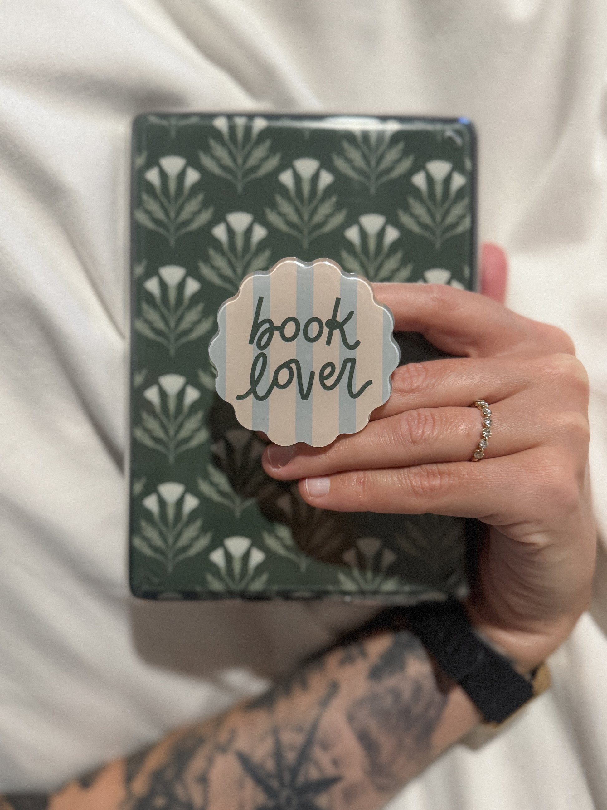 E-readers, these are for you! This Kindle grip features morally, hand lettering and artwork and its own adhesive MagSafe base for attaching your grip. Attach to your Kindle or other e-reader device, your phone, or your tablet for a comfortable hold. These are a wonderful gift for you, your book club, or any book lover!