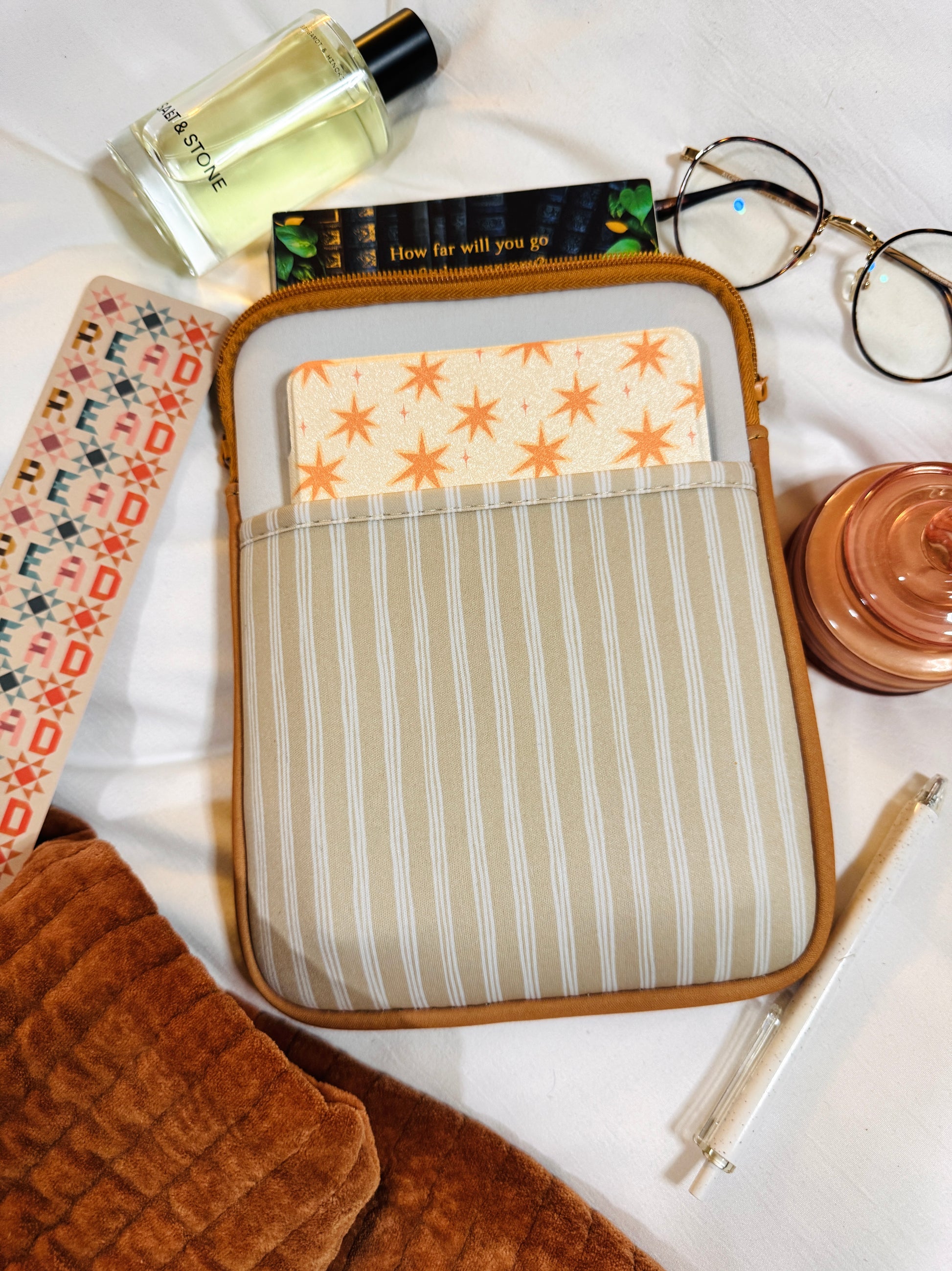 Protect your Kindle and/or your books with this functional sleeve, featuring hand drawn original artwork by morally. Made of neoprene with two zippers for closure and available in two sizes. The medium pouch is great for carrying your e-reader, a small(er) paperback book, or iPad, as well as pens, bookmarks, and annotation accessories. The large is great for a hardcover, your planner, e-readers, and more.